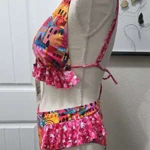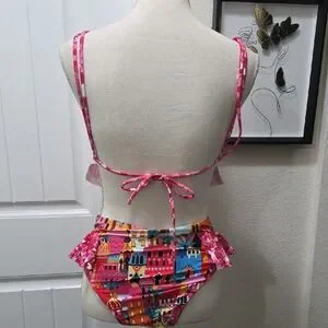 Vibrant bikini set with ruffle details. Features a colorful cityscape pattern.