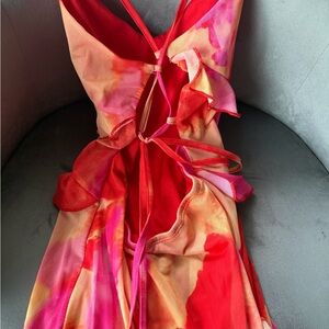 Eye-catching maxi dress with pink and orange ruffles. Perfect for a bold look.