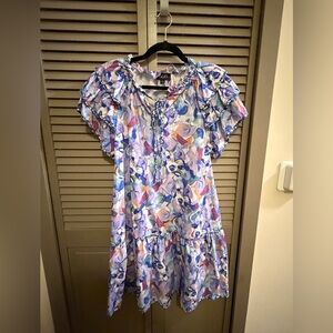 Charming dress with vibrant patterns and ruffle sleeves. Ideal for a cheerful style.