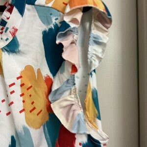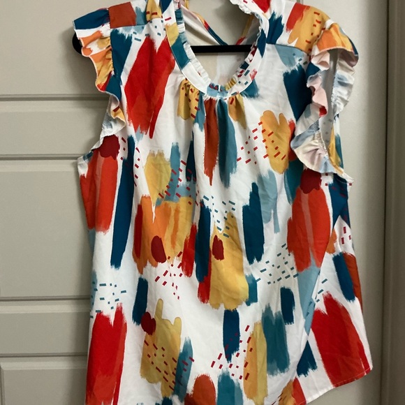 Brighten up your wardrobe with this colorful ruffle sleeve top. Featuring a playful mix of red, orange, blue, and yellow, this shirt is perfect for any occasion.