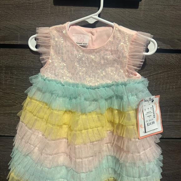 Adorable baby dress with ruffled layers in pink, yellow, and blue. Features a sparkly top for added charm.