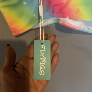 Vibrant bikini top with ruffled straps. Features a rainbow gradient design.