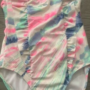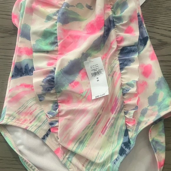 Gap Kids one piece size m (8) never worn. My daughter tried on and didn’t like it. Vibrant one-piece swimsuit with ruffle details. Features a mix of pink, green, and blue colors. Still have tag but it somehow got pulled off.