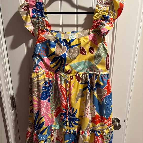 Vibrant sundress with ruffled straps. Features a colorful tropical print.