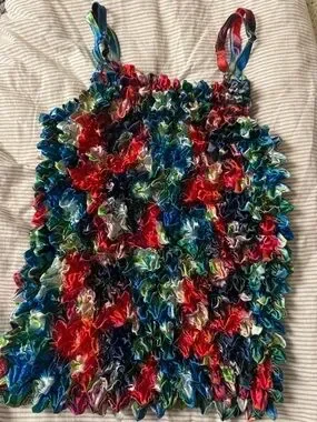 Eye-catching multicolor tank top with a unique ruffled texture. Lightweight stretch fabric offers comfortable wear. Spaghetti straps provide a flattering silhouette. Perfect for casual outings and layered looks. Includes vibrant red, blue, green, white, and black tones.