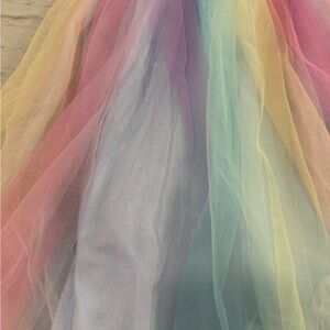 Adorable dress with ruffled sleeves and a colorful tulle skirt. Perfect for special occasions.