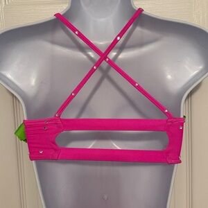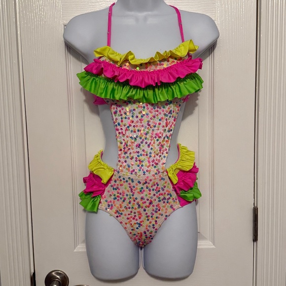 Vibrant one-piece dance costume with ruffled details. Features a mix of pink, green, and yellow colors.