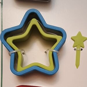 Set of colorful sandwich cutters in fun shapes. Includes house, star, and square designs. Perfect for creative meals.