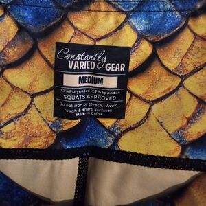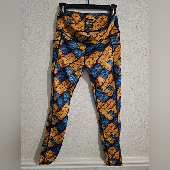 NWOT Vibrant full length leggings with a scale pattern. Features blue and yellowish orange colors. A pocket on both legs. These leggings are great for working out.