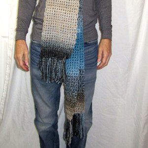 I crocheted this Colorful Scarf. I handmade it using a loose knit crochet stitch to about 97 inches long x 8 inches wide with fringe on both ends.