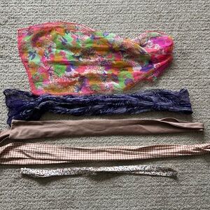 Vibrant set of scarves featuring floral and abstract patterns. Includes pink, purple, brown, and multicolor designs. Perfect for adding a pop of color to any outfit.