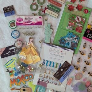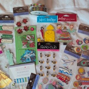 Vibrant assortment of scrapbook stickers. Includes various themes and designs. Perfect for crafting and decoration. Lot includes 20 items.