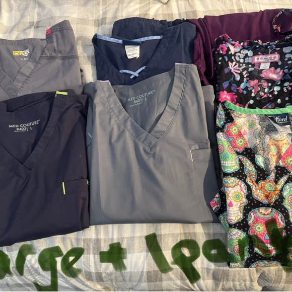 A vibrant collection of scrub tops featuring various colors and patterns. Perfect for adding a splash of color to your work attire.
