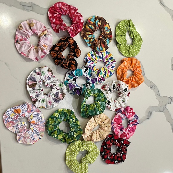 Set of vibrant scrunchies in various colors and patterns. Perfect for adding a pop of color to any hairstyle. 17 scrunchies, including holiday themed.