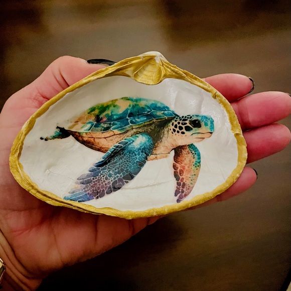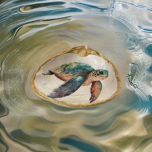 Bring a piece of the ocean into your home with our Colorful Sea Turtle gift! This beautifully crafted shell captures the vibrant and playful personality of these magnificent creatures. The pearlized background and gold edging make it a unique and eye-catching addition to any collection. Measuring 4 1/2 inches across, it's the perfect size to display on a shelf or desk. Customize the size upon request and make a gift that is as unique as the sea turtle itself. Whether you're a sea turtle lover or just appreciate the beauty of nature, this gift is sure to make a splash