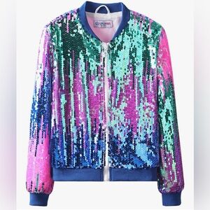 Vibrant sequin jacket with a mix of pink, blue, and green. Eye-catching and stylish.