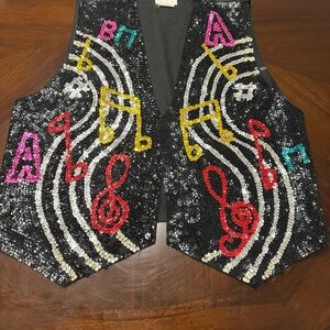 Gently used , Vibrant vest with colorful sequin music notes. Features black base with red, pink, yellow, green, and white accents. Smoke and pet free home.
