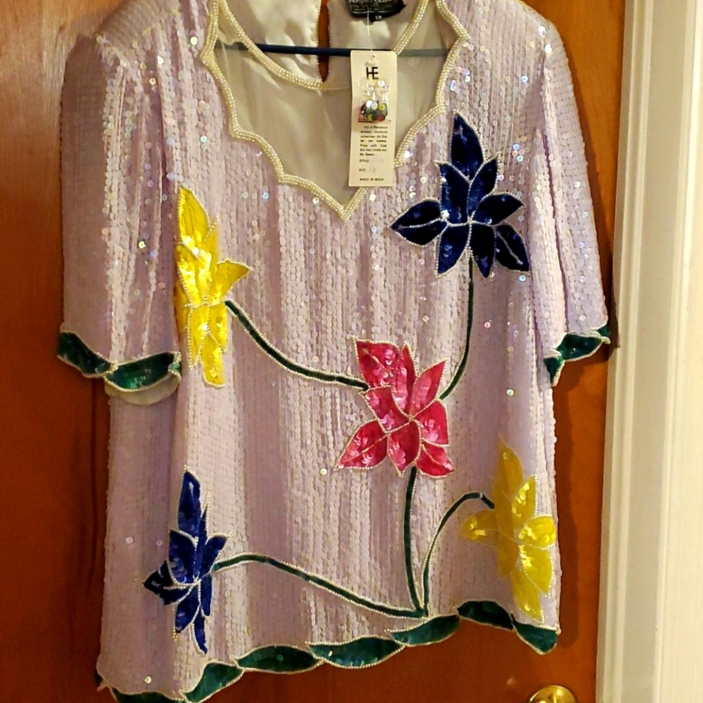 Totally Sequined Top, White with yellow, pink, blue flowers with some green! Adorable top! Can be worn for any occasion. Reasonable offers welcome