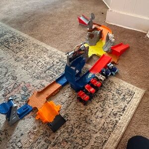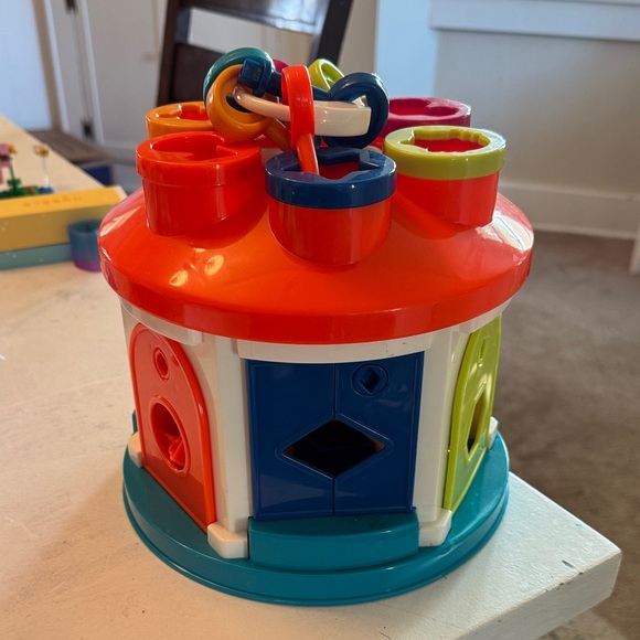 Engage your child's curiosity with this vibrant shape sorting toy. Featuring bright colors like orange, blue, and green, it's perfect for developing motor skills and color recognition. Missing one dark blue shape.