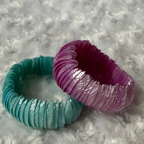 Set of two shell bracelets in vibrant colors. Perfect for adding a pop of color to any outfit.