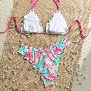 Vibrant bikini set with shell print. Features pink, green, and white colors.