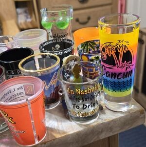 Vibrant collection of shot glasses. Features various designs and colors including black, silver, pink, and orange.