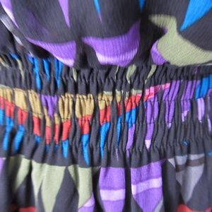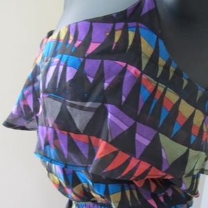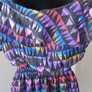 Lively and comfortable spaghetti strapped mini in a bold, geometric pattern. The elasticized waist and the flutter hem and bodice are very playful and casual, yet if you paired with a strappy mule and a black jacket, you're ready for cocktails! Silk, fully lined.