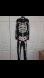 Black pajama set with colorful skeleton design. Features vibrant patterns in blue, yellow, and red.