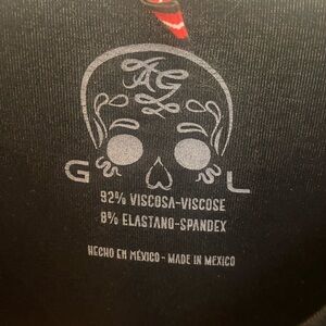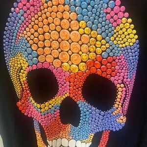 Black t-shirt with a vibrant skull graphic in pink, orange, yellow, blue, and purple. This shirt looks fabulous in person. I got so many compliments wearing it. Stand out, stand proud. Be one of a kind.
