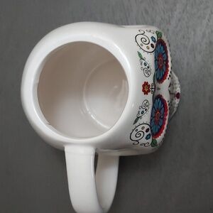 White skull-shaped mug with colorful floral designs. Features blue, red, and green accents. 15 oz capacity.