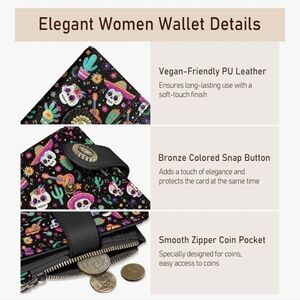 Vibrant wallet with skull and floral patterns. Features advanced RFID-blocking technology.