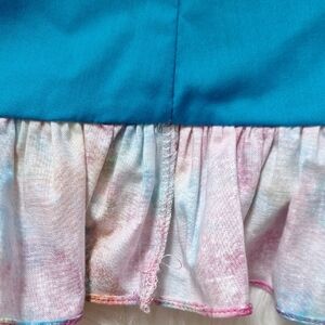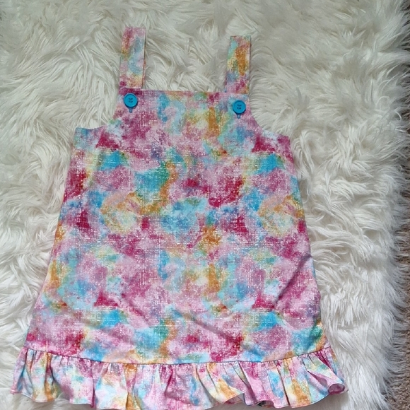 Vibrant sleeveless dress featuring a multicolor pattern and ruffle hem. Accented with blue buttons. This is a new, handmade by me, dress perfect for any time. It is full lined and is 100% cotton. All seams are hidden except the ruffle, but it is serged.