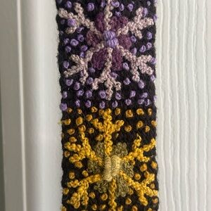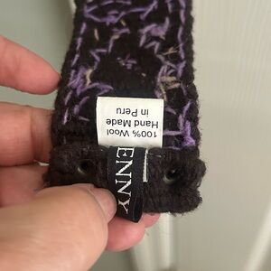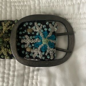 Vibrant belt with a snowflake pattern. Features multiple colors including black, orange, yellow, green, blue, and purple. Handmade in Peru. 36 inches from buckle to end. 31 inches from buckle to first set of holes.