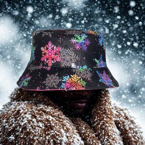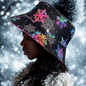 Vibrant hat with a snowflake design. Perfect for winter fashion. Eye-catching and unique.This handmade bucket hat is the perfect accessory for any occasion. With a pattern of snowflakes, this multicolor hat is perfect for winter and fall seasons. Made of a cotton blend fabric, it is lightweight, packable, quick-drying, and breathable.