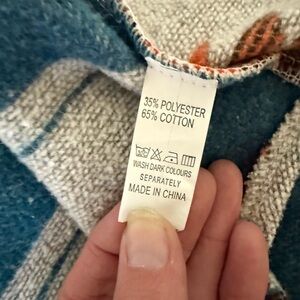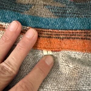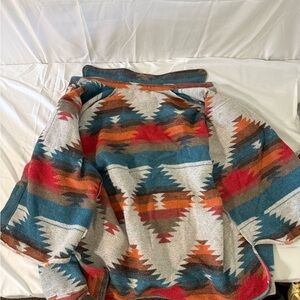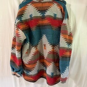 Vibrant jacket with a Southwestern pattern. Features shades of red, blue, and orange.