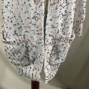 Cozy knit cardigan with colorful speckles. Open front design. Perfect for layering.