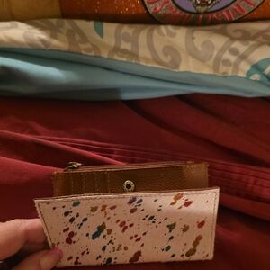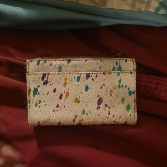 Stylish wallet with a colorful splatter print. Perfect for adding a pop of color to your accessories.