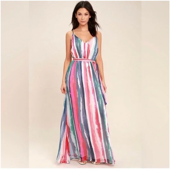 Watercolor inspired striped maxi dress by BB Dakota. Tie waist. Size Medium. Purchased from ModCloth and worn once or twice.