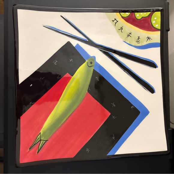 Mary Naylor Design Hand painted Square ceramic plate featuring a vibrant fish sushi i design. Includes red, blue, and black accents.