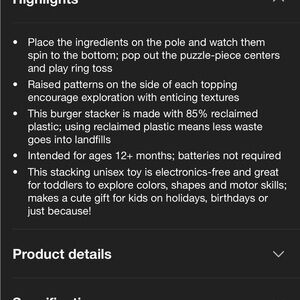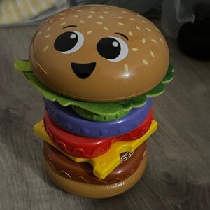 Engage your child with this vibrant stackable burger play set. Featuring pieces in red, green, purple, and brown, it's perfect for imaginative play and learning.