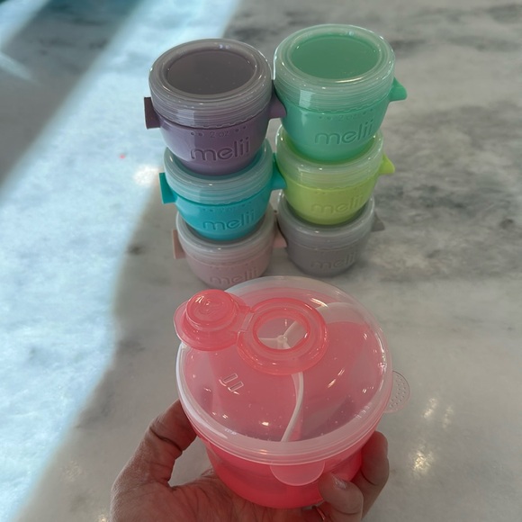 Munchkin is the brand of the pink and Melii is the brand of the connecting containers