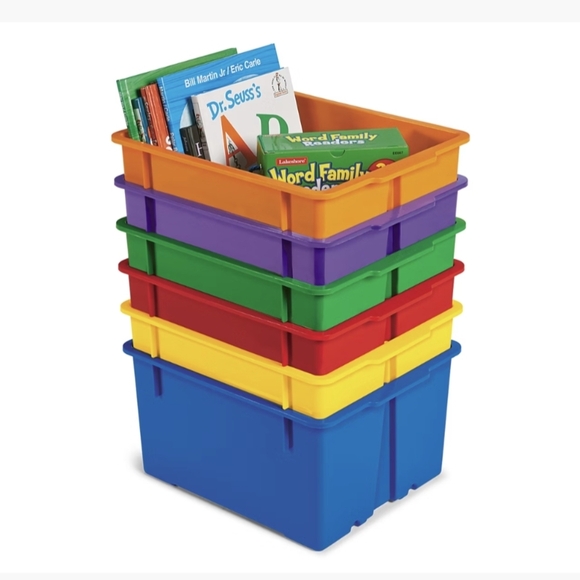 Organize your space with these vibrant stackable storage bins. Perfect for books, toys, and more. Available in orange, purple, green, yellow, and blue.
