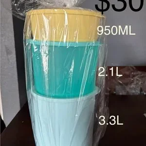 Set of three stackable storage containers in yellow, teal, and light blue. Perfect for organizing your kitchen.