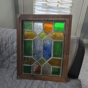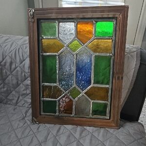 Beautiful stained glass window panel with vibrant colors. Features green, orange, blue, and clear glass pieces. Perfect for adding a touch of color to any room.