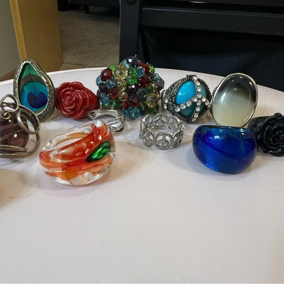 A vibrant collection of statement rings featuring various colors and designs. Perfect for adding a pop of color to any outfit. Size 8 or smaller, some are adjustable bands.