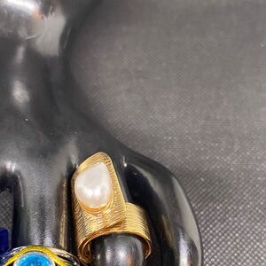 Bundle of 5 of bold statement rings in various colors. Features blue, green, gold, and silver tones. Perfect for adding flair to any outfit. sizes 6 to 7. Smoke free home.