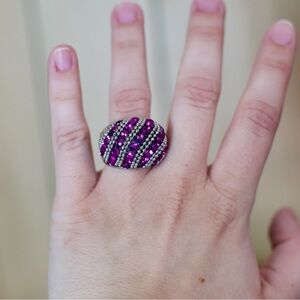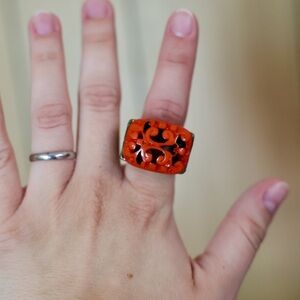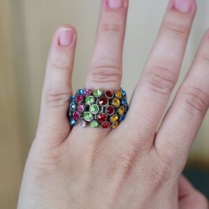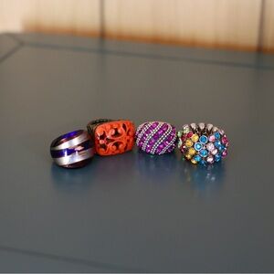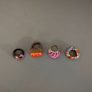 Set of four colorful statement rings. Features vibrant designs with purple, orange, pink, and multicolor accents. Perfect for adding a pop of color to any outfit. 2 of the rings have elastic bands so they will fit multiple sized fingers.