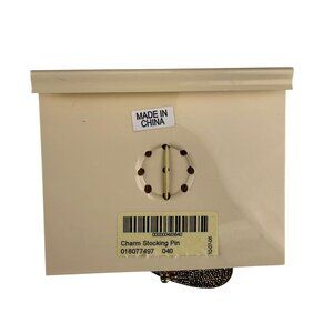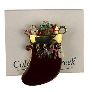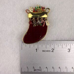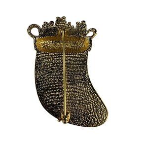 This delightful Gold Tone Stocking Brooch embodies the whimsical charms of the holiday season. Crafted with attention to intricate detail, the brooch features a red enamel stocking filled with colorful, miniature representations of wrapped gifts, candy canes, and holly. Dangling charms, including a gingerbread man, candy cane, snowman, and beads, add an enchanting sense of movement and festive cheer, reminiscent of classic holiday celebrations.The textured gold-tone backing adds a vintage appeal, while the pin clasp offers secure fastening. The brooch, set on its original branded card, provides an additional layer of authenticity. Measuring approximately 2.25 inches in height and just under 2 inches in width, this brooch is the perfect accent for sweaters, scarves, or coats during the holiday season.A delightful keepsake or gift, this accessory bears the mark of a well-loved vintage-inspired piece yet remains in excellent condition. Made of durable materials, it reflects timeless Christmas joy. It was lovingly crafted and designed to evoke fond memories of holidays past, with its intricate details and charm-filled embellishments.