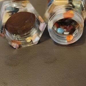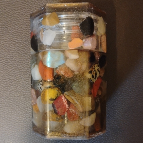 Unique resin container with embedded colorful stones. With a Golden Brown Micah top and bottom. Perfect for decor or storage.