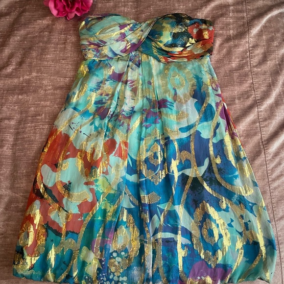 Vibrant strapless dress with a mix of colors. Perfect for a bold statement.